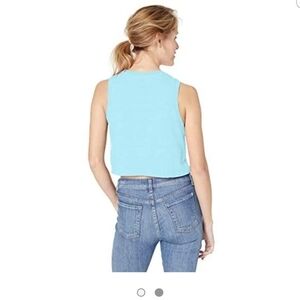 Light blue crop top with striped rainbow lettering, size XL.