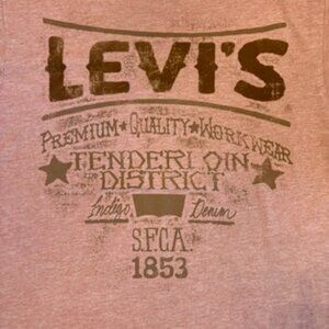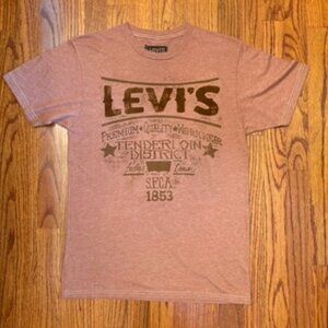 Classic LEVI’S graphic tee in a heathered brown shade with bold front logo print: “Levi’s Premium Quality Workwear – Tenderloin District SFCA 1853.” Features short sleeves, crew neckline, and soft cotton-blend fabric for everyday comfort. Perfect for casual wear or layering.