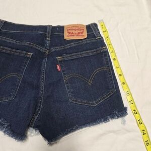 Pre-owned Levis high rise shorts in great condition. Dark wash with frayed hem. 100% cotton, Button fly