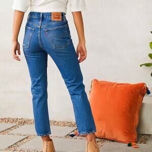 Medium wash high rise 501 straight leg jeans by Levi's.