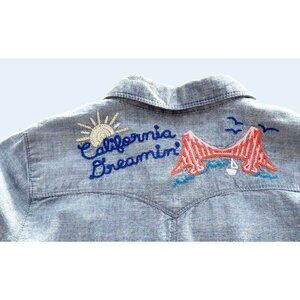 Great Levi's kids / youth shirt. Full button with snap buttons. Western style stitching. Embroidered sun, rainbow, and bike on front. "California Dreamin'" on back. 100% cotton. Size M 10-12 years. Pre-owned and gently worn in really nice condition!