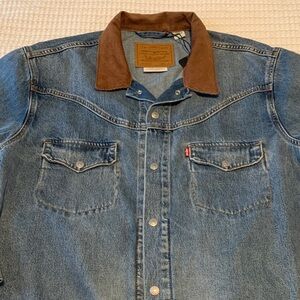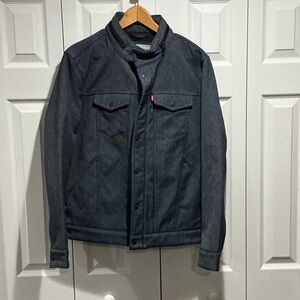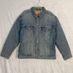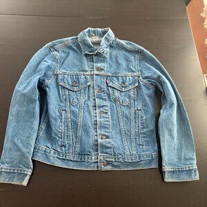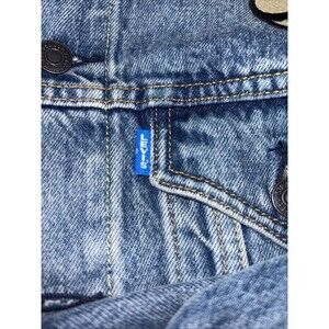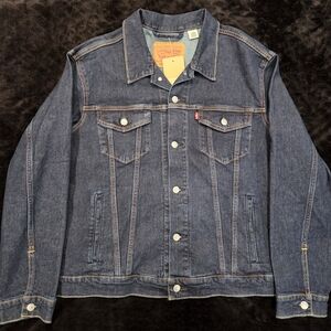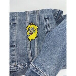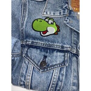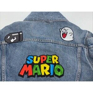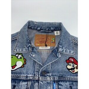 The product is a Levi's Nintendo Super Mario men's vintage fit trucker denim jacket in size small. Made of cotton denim in an indigo pattern, this snap-closure jacket features a Super Mario theme and is in new without tag condition. The blue color and regular fit make it a stylish and unique addition to any man's wardrobe, perfect for fans of the iconic video game franchise.