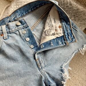 Classic and timeless. The OG denim shorts. Levi’s 501’s in the perfect light-but-not-too-light blue wash. Button fly. 5 pocket. Rigid 100% cotton denim that molds to your body with wear. Size 25. Great pre-loved condition.