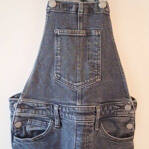 These are authentic Levi's overalls in a distressed black denim shade. They are in Excellent Used Condition.