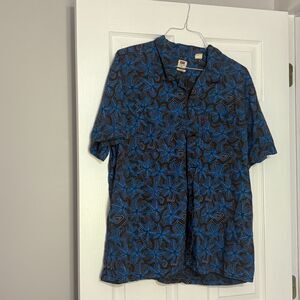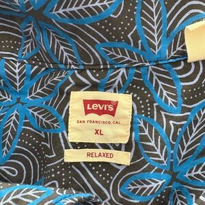 The LEVI'S Relaxed Fit Short Sleeve Shirt in size XL features a blue and brown Hawaiian floral design, adding a touch of outdoor and retro style to your casual look. Made from a cotton blend fabric, this classic button-up shirt is perfect for any season, with a comfortable relaxed fit and short sleeves for a laid-back vibe. The shirt also includes a collared neckline, point collar style, and convenient pockets for added functionality. Machine washable and ideal for regular wear, this LEVI'S shirt combines style and comfort effortlessly.