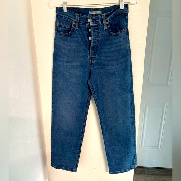 Great condition ! Button front , size 28 and measure Waist 14-1/2” Rise 12” measured to TOP of waistband. Inseam 26” . Width at cuff 8” .