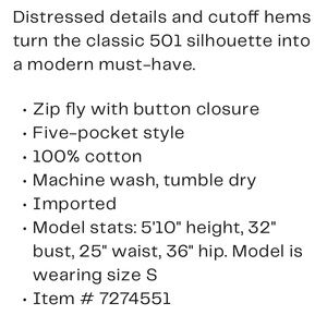 Levi’s 501 Distressed Shorts Size 24. In Quiet Riot Blue. High Rise, Med Wash, Button Fly 100% Cotton. Aprox: Waist 13” Rise 10” Hips 16.5” Inseam 2”. Sold at Free People. NEW WithTags. Offers Welcome! PM3612