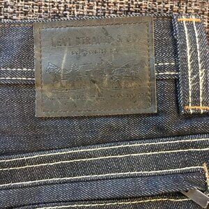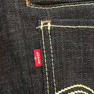 The following details make these jeans pretty rare: black leather tag with black lettering, zipper pockets on the back, above the usual back pockets, metal Levis logo on the back pocket, dark metal rivets, dark metal embossed button, and a triangular inner label.