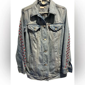 LEVI'S Vintage Trucker Jacket Studded Denim Womens Medium Light Wash. red and silver square studs— all in tact