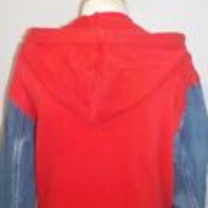DENIM BLUE IN COLOR WITH RED KNIT BACK PANEL AND HOOD