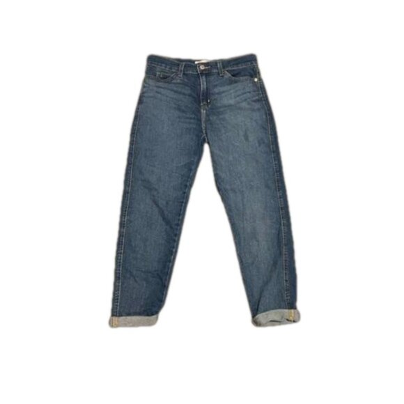 Levis boyfriend cut jeans size 427 this pair of jeans are vary comfortable they have a rolled hem on the bottom and are a dark blue colour.