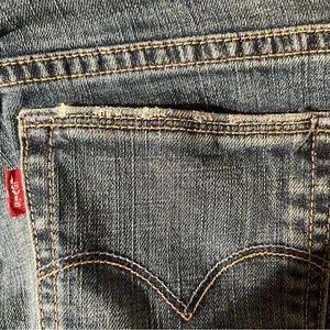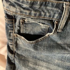 Levi’s classic 365 high-waisted Bermuda shorts in lapis blue. Sewn cuffed hem. Both front and back pockets are slightly frayed as in the photos, giving them a worn, rustic, vintage feel. Size 2/26. 12” rise, 19” length. Free pickup inn San Francisco, CA.