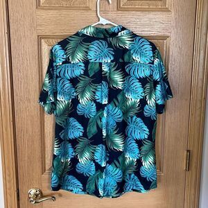 This shirt is made by LE VONFORT. It’s a navy blue, short sleeve polo with green and blue palm leaves. This top does not have buttons at the neckline. Worn for just a couple of golf outings. Size large and in wonderful pre owned condition. Smoke and pet free home.