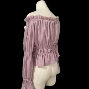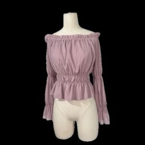 Chic off-shoulder blouse in a soft lilac shade. Features ruffled edges and a smocked waist for a flattering fit.