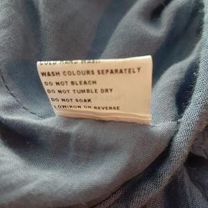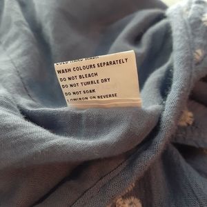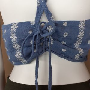 This top is a chambray-style blue with white embroidered daisies & stitching and has a lace up back