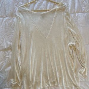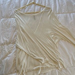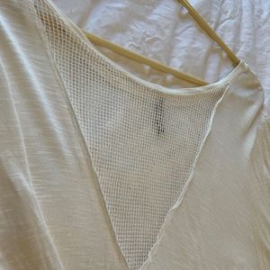 LF Emma & Sam women's long sleeved top. Mesh detailing in v-shape to give v-neck feel. Very loose and flowy / light weight. Really cute to dress up with a cute bralette underneath.