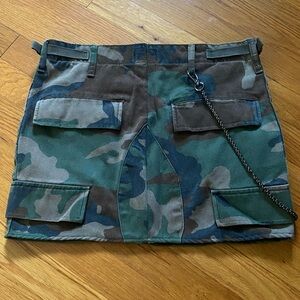 Stylish camouflage mini skirt featuring a neon green zipper and keychain. Perfect for a trendy look.