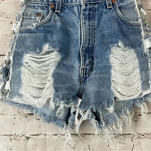 Furst of A Kind Denim Shorts, sold exclusively at LF. Vintage Levis repurposed and reworked into denim shorts. One of a kind distressed medium wash blue high rise shorts with O-Ring cutout side detail. No Size/Content tag so please see measurement's. Retail $196.00. Gently Used. Please see picture's.
