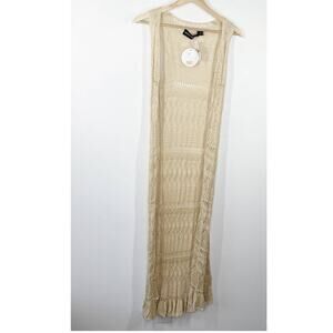 Cream tan duster cardigan. Sleeveless, open front, longer length. $144 original retail.