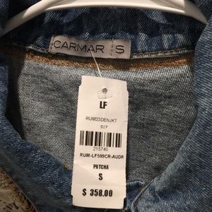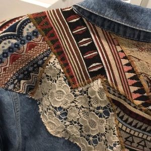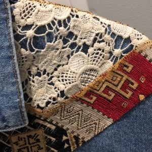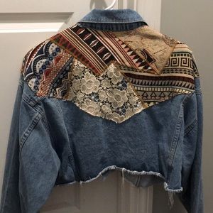 Different fabrics patched up near the top of this incredibly trendy cropped jean jacket