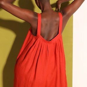 The Basic Linen Romper is made with a soft, lightweight linen perfect for summer. It has a playful, oversized fit with deep pockets. L.F.Markey's sun and wave woven patch features on the left leg. Available in Paprika and Cobalt.