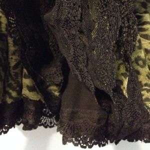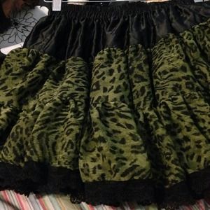 No trades. Tutu style skirt with elastic waist and a bunch of layers/underskirts. Olive/forest green cheetah print hemmed with black lace and gathered.