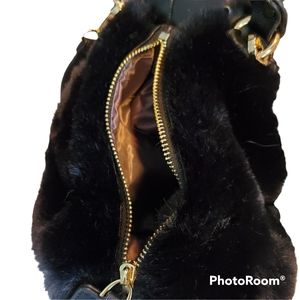 From the Southampton LF Boutique. Vegan leather, fun fur , satin lined. Shoulder straps ( adjustable) and handle.