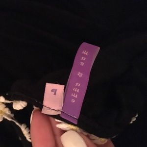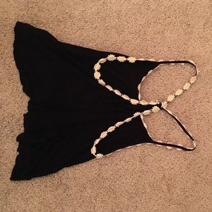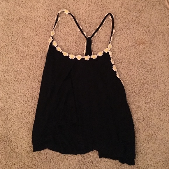 Black razor back crop top with yellow and white flowers detailed around the straps. In good condition- only wore a couple of times. (the tag says large but it is fairly small).