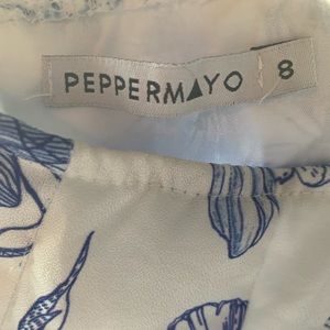 LF/Peppermayo Romper with crocheted top, open back with crossed straps, and a short, lightweight, printed bottom. Worn minimally and is in good condition!