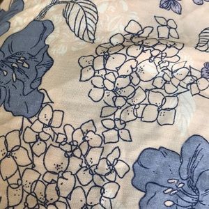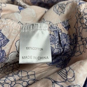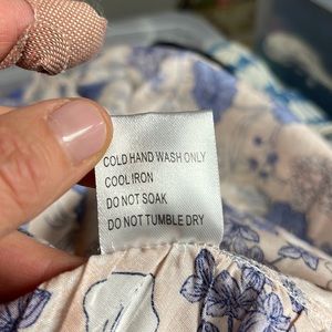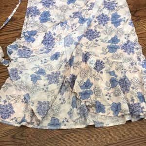 16 waist laying flat. Can be made looser or tighter because it’s a wrap style. Ruffle on bottom or entire skirt. Color is periwinkle flowers in pale pink/peach background