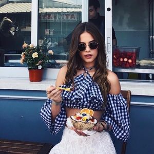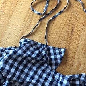 LF Stores gingham halter crop top with exposed shoulders | BNWT | size small | elastic band on the edges of the bandeau and the sleeves | originally $96.