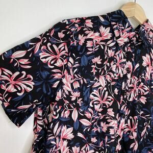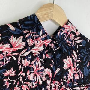 Black red floral print button front crop shirt. Collared neckline, short sleeves, button front. Allover floral print.