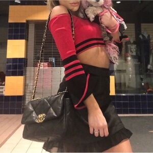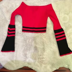 🎀 LF Seek The Label Red & Black Flowy Flare Sleeve Stripe Off Shoulder Crop Top