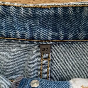 LF - Side Logo Tape Distressed Ripped High Waist Jean Shorts in Blue and White