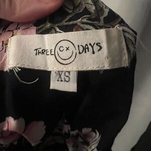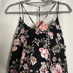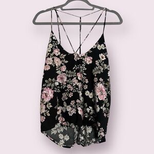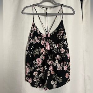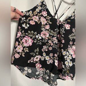 LF Three Days Black and Pink Floral Strappy Cami Blouse. Black with pink and white floral pattern. Skinny spaghetti straps from the shoulders and the center of the shirt that cross. T style back. Lightweight. Worn once. Size XS, but fits larger.