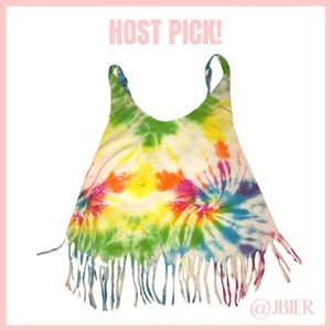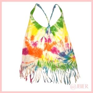 LF Tie-Dye Crop Top features a criss-cross open back and fringe on the bottom hem. Style with our J Brand Hot Pink Cuffed Denim Shorts and The Mackenzie Cat-Eye Sunglasses for a fun, colorful summer festival look. Excellent condition.