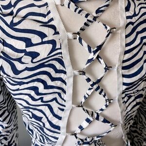 LF Brand Millau crop top. Long sleeves. Slightly flared sleeve. Deep v-neck front. Tie up back. Two button back closure. Additional button included. Navy blue and white striped print. Size extra small. New with tags. One side of the brand tag is unattached, price tags are loose.