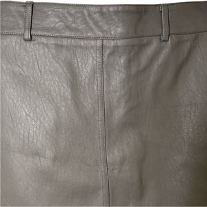 Gray faux leather mini skirt with belt loops on front and back. Seam down front center, half seams down back and hidden zipper closure on back.