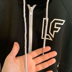 Black and white zip up style jacket by LF. White zipper closure front and center. Hooded. Drawstring pull on hood and neckline. Two zipper pockets on front sideZ “LF” tape down side of arms. Size medium.