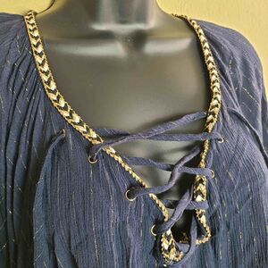 This is a long sleeved navy and gold top by Three Days, a LF brand. It has a high low hem with raw detailing. At the neckline is a corset style panel and a gold and black embroidered edge. The edge also goes around the middle of this top. Note the cuffs on the sleeves are elastic.