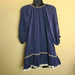 This is a long sleeved navy and gold top by Three Days, a LF brand. It has a high low hem with raw detailing. At the neckline is a corset style panel and a gold and black embroidered edge. The edge also goes around the middle of this top. Note the cuffs on the sleeves are elastic.