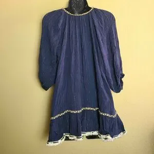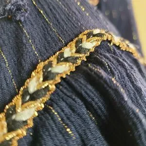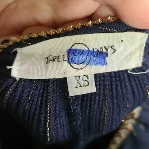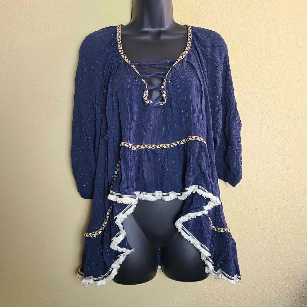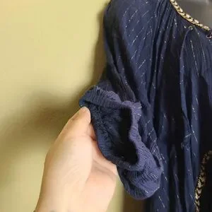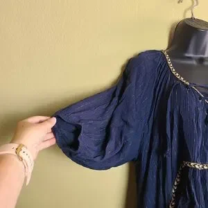 This is a long sleeved navy and gold top by Three Days, a LF brand. It has a high low hem with raw detailing. At the neckline is a corset style panel and a gold and black embroidered edge. The edge also goes around the middle of this top. Note the cuffs on the sleeves are elastic.