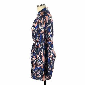 Features blue and white and pink abstract print all over, long sleeve, waist tie.
