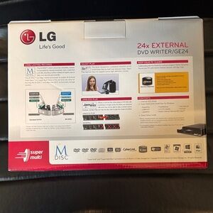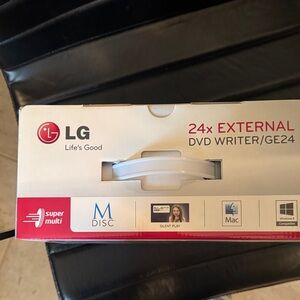 Efficient and sleek DVD writer. Supports high-speed data transfer. Ideal for multimedia tasks. LG 24x external. DVD writer/GE24 with silent play still in the box never even opened