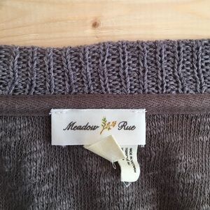 LG Anthropologie / Meadow Rue Sweater. Excellent pre loved condition. Maybe worn 2-3 times and hand washed. Lightweight and super comfy. 3/4 sleeved. Super cute details with fabric and cut. Slightly longer in the back. Color: smoky purplish gray - gorgeous on! Fabric: cotton & polyester. Measurements: 29" front, 32" back, 19" pit to pit. Smoke free - pet free home. 🌺