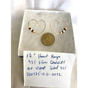 LG Beautiful 1 1/2” dangle 925 Silver Heart Hoop Earrings. These Beauties have no stamp but tested 925 silver. This item is sourced from an estate sale and the firmer owner had exquisite tastes. The truly great craftsmanship make this item a true work of art and with its pristine condition It is truly A great value of fine jewelry at costume pricing! Let’s make it yours!