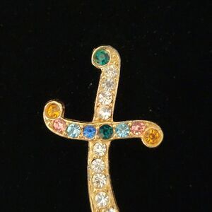 Brilliant large Arabian Knights pin/brooch featuring large faceted crystals or rhinestones. It is much more sparkly in person than the pictures show. This is a Scimitar style curved sword, the blade is clear crystals and the hilt is assorted colored crystals which are darker and more intense in person with a gold tone backing/outline. Pin is unsigned but seems to be nice quality. Could be adapted to a hair ornament or pendant as well.