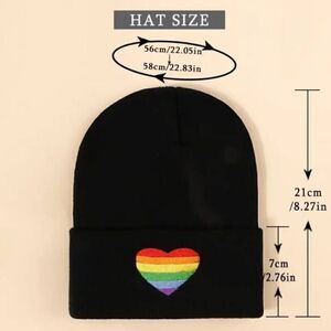Show off your support for the LGBT community with this brand new stylish black beanie skull cap featuring a beautiful rainbow heart embroidery. This unisex accessory is perfect for anyone looking to add a pop of color and positivity to their outfit. The cap is one size fits all, making it a great gift option as well.