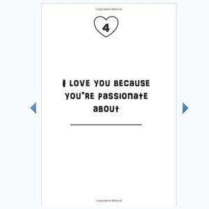 This book contains fill-in-the-blank lines describing some aspect of your affection for a loved one. A thin sharpie marker is recommended to write his/her name on the front cover. Simple prompts make it easy to express yourself to him or her. Just complete each line and voila: you have a uniquely personal gift your loved one will cherish forever.Make it as loving, mushy, racy, or witty as you choose!