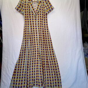 LHD Blue Plum Yellow Gingham Button Down Short Sleeve Silk Dress Size 4